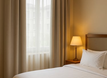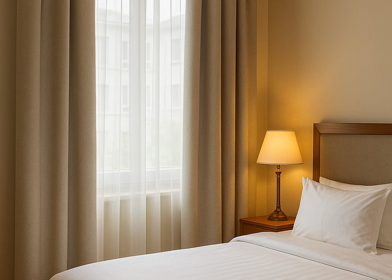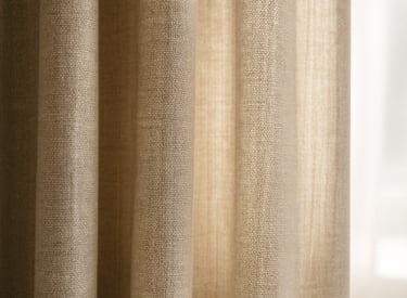 Tons suaves e tecidos fluidos que criam ambientes tranquilos e sofisticados. Ideais para quartos de hotel ou salas amplas com luz natural.